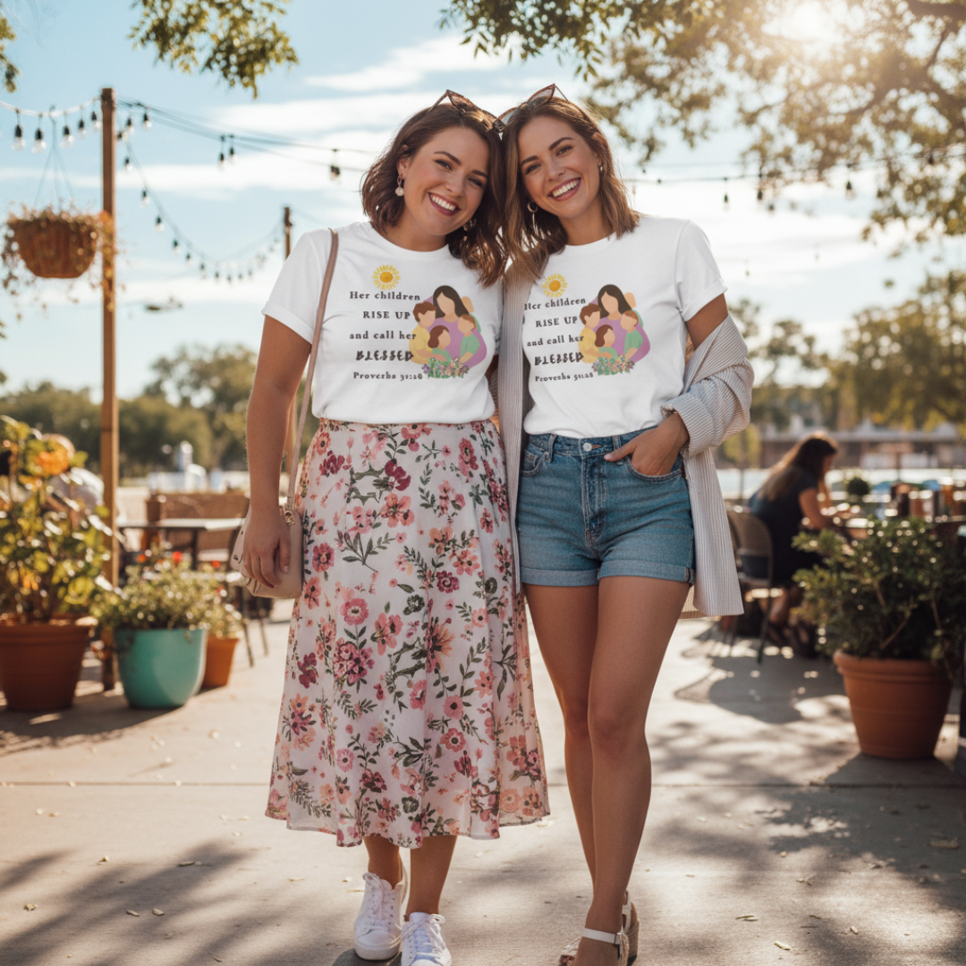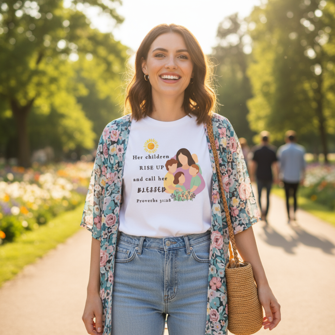 Celebrate faith and motherhood with our Softstyle Tee, inspired by Proverbs 31:28. With the verse “Her children rise up and call her blessed,” this shirt is a beautiful reminder of a mother’s calling and the strength found in standing firm on God’s Word.