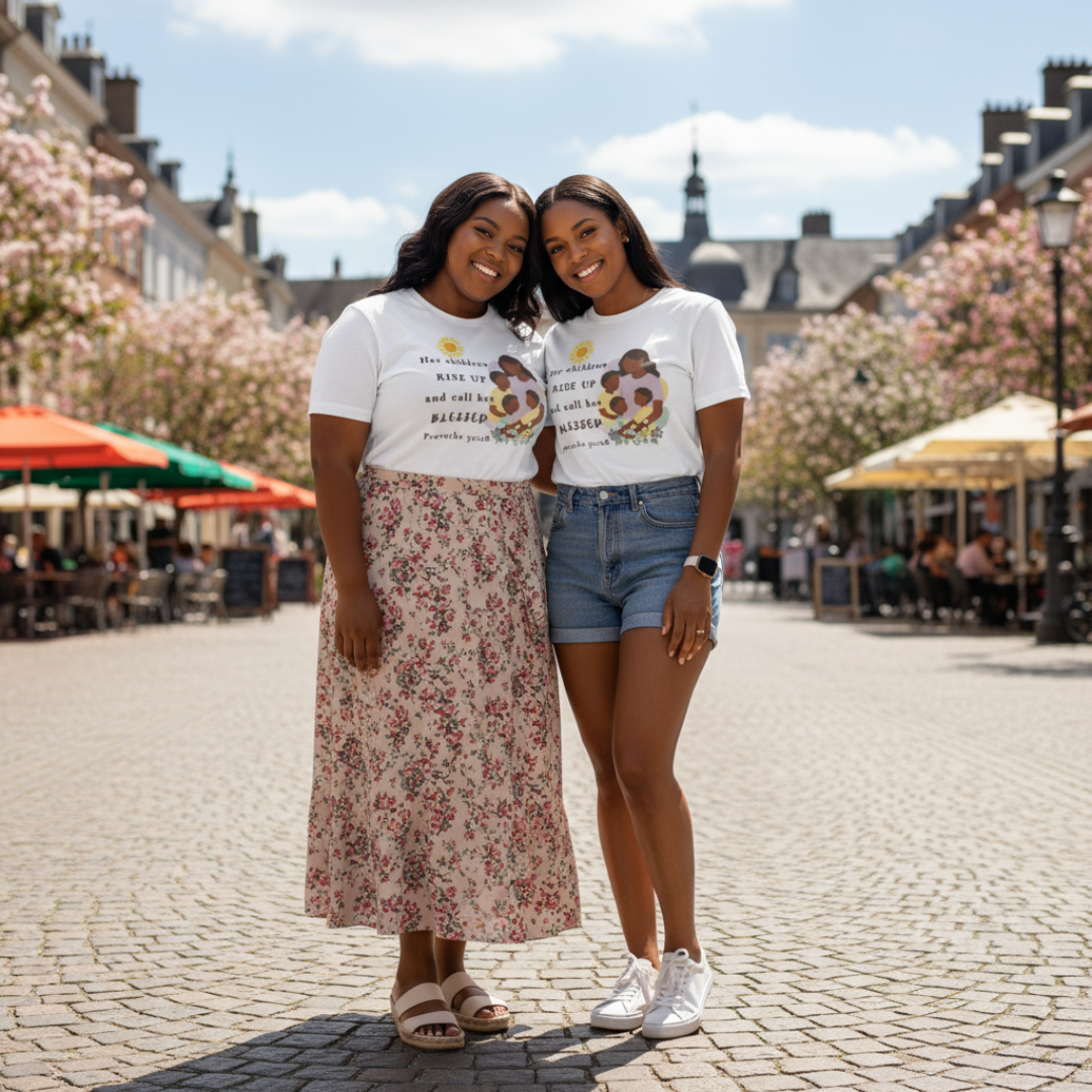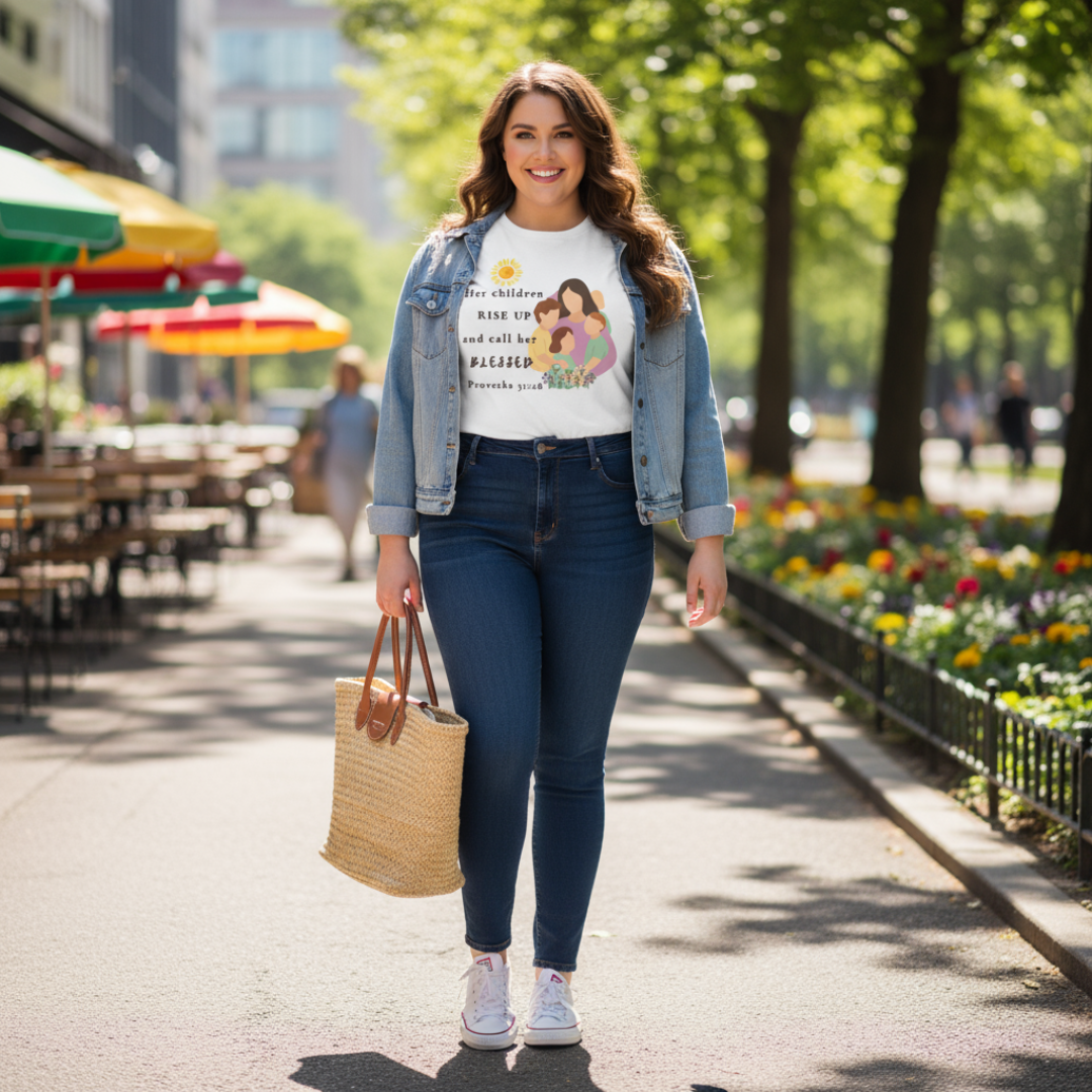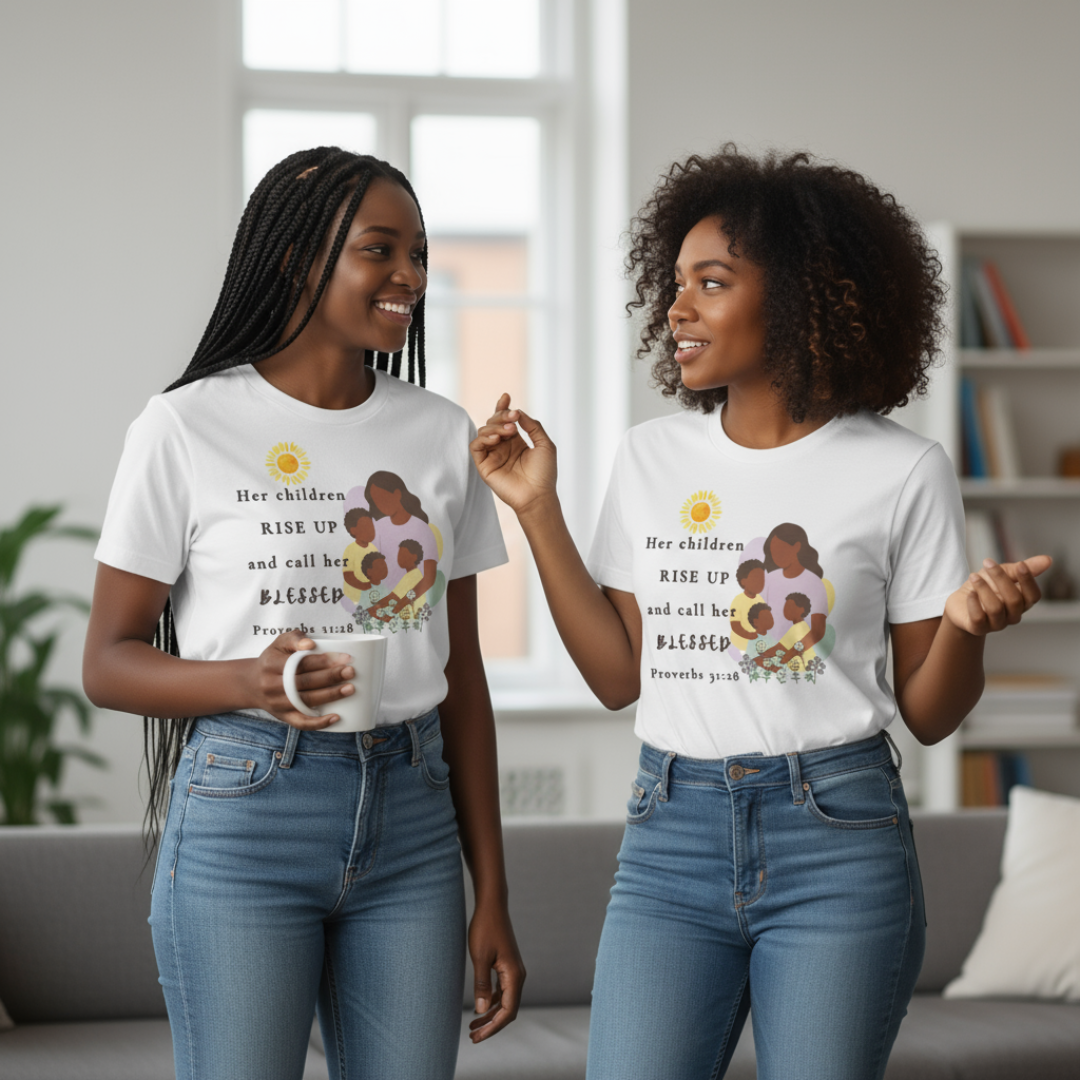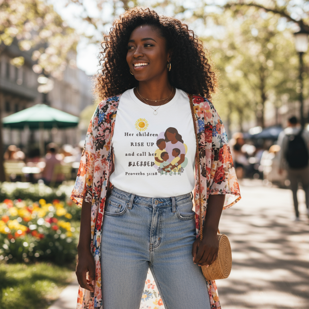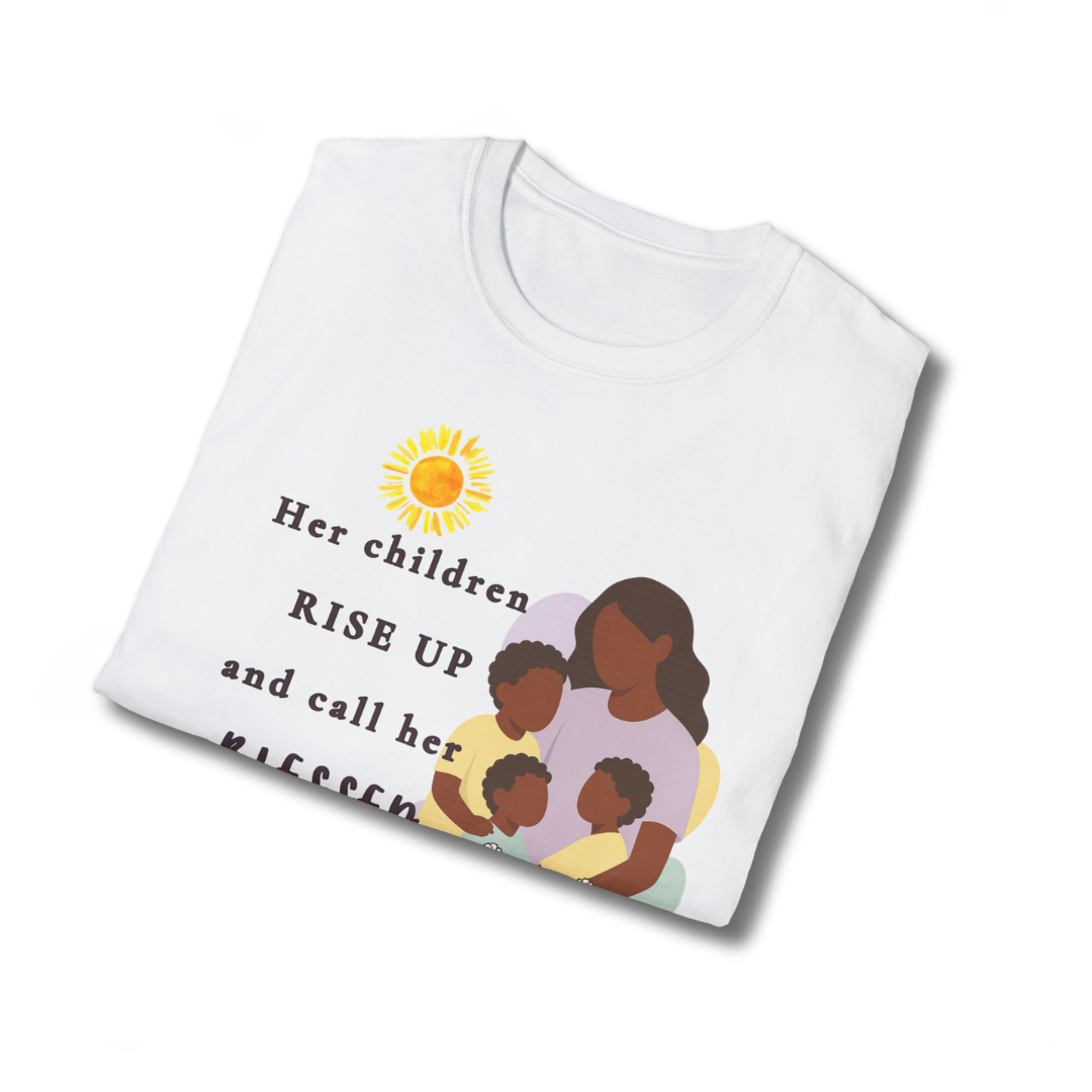 Celebrate faith and motherhood with our Softstyle Tee, inspired by Proverbs 31:28. With the verse “Her children rise up and call her blessed,” this shirt is a beautiful reminder of a mother’s calling and the strength found in standing firm on God’s Word.
